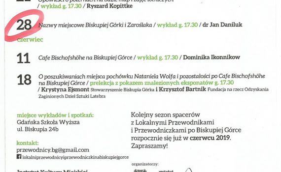 O zmianach nazw miejscowych na Piaskowni, Zaroślaku i Biskupiej Górce już w ten wtorek, 28 maja, będzie mówił dr Jan Daniluk. Początek o godz. 17.30. Lokalni Przewodnicy i Przewodniczki na Biskupiej Górce zapraszają do siedziby Gdańskiej Szkoły Wyższej przy ul. Biskupiej 24B. ke