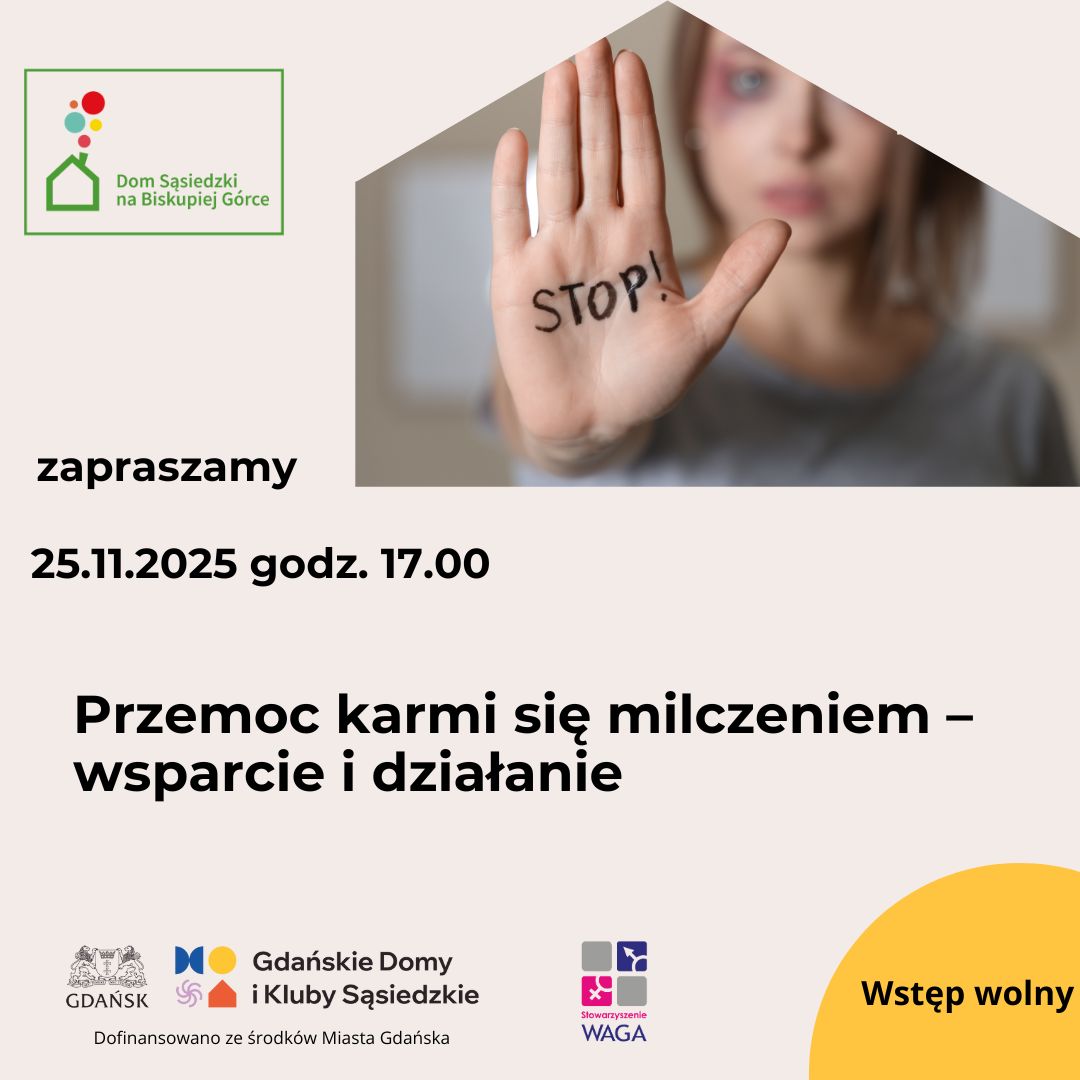 25 listopada to Międzynarodowy Dzień Eliminacji Przemocy wobec Kobiet. Z tej okazji stowarzyszenie Waga zaprasza na spotkanie pt. „Przemoc karmi się milczeniem – wsparcie i działanie”, które poprowadzi podkomisarz Ewelina Szulczak, koordynatorka procedury „Niebieskiej Karty”, specjalistka Wydziału Prewencji Komendy Miejskiej Policji w Gdańsku.