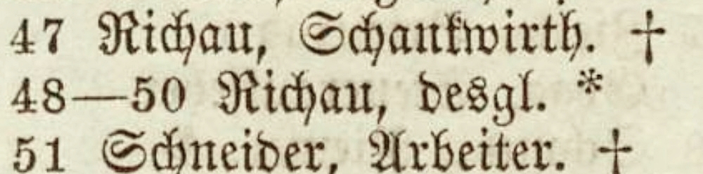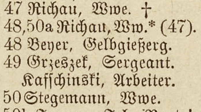 1864-65 r. to najwcześniejsza księga adresowa, w której mamy wpisanego właściciela parceli 47 48, Johanna Richau, opisanego jako szynkarz (Schankwirt.). Pan Richau ma łącznie cztery nieruchomości, w których mieszkały od jednej do czterech rodzin, są to więc niewielkie domy, typowa dla tego okresu zabudowa przedmiejska. Nie wiemy, czy również pod tym adresem prowadził szynk.