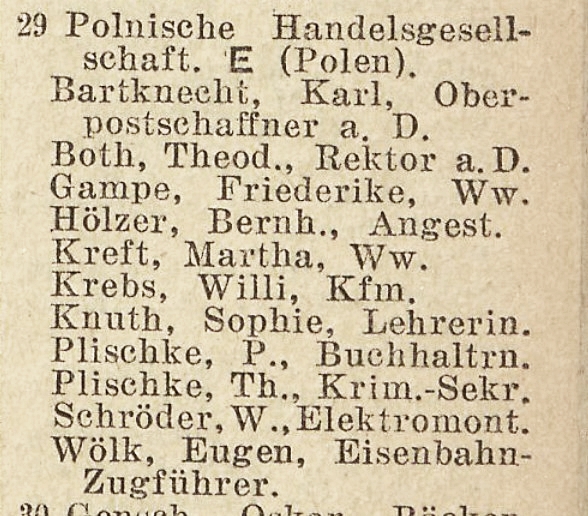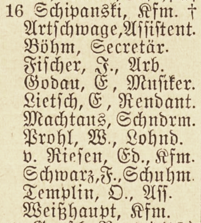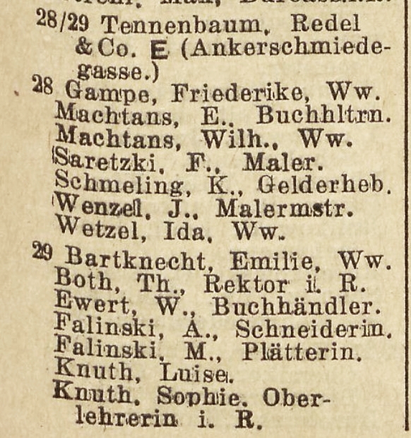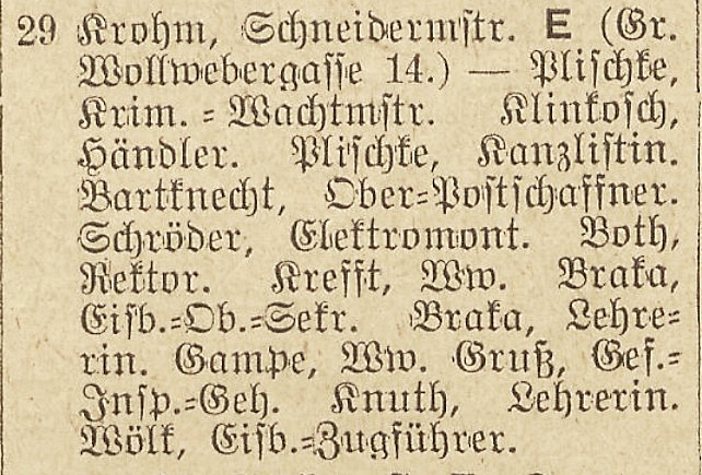 Niestety brakuje w bibliotekach cyfrowych ksiąg adresowych Gdańska z lat 1891-1895. Na podstawie księgi z 1896 r. widzimy, jak zmieniła się ilość lokatorów i ich profil społeczny. U państwa Richau mieszkali robotnicy, wdowy i drobni rzemieślnicy, w kamienicy pana Schipanskiego – kupcy, sekretarz sądu rejonowego, muzyk, nauczyciele, urzędnicy, mistrz szewski i osoby wielu innych zawodów.