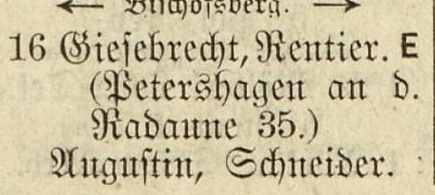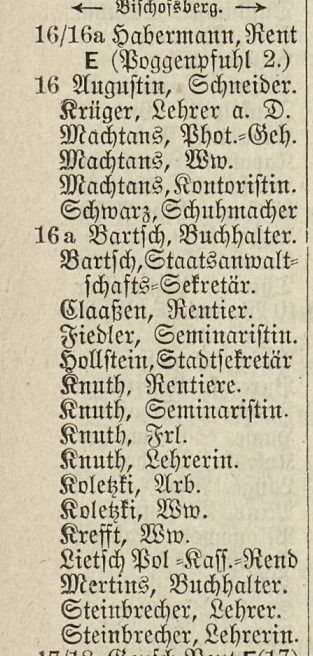1905 r. – już rok później dom odkupuje Emil Habermann, rentier mieszkający przy Poggenpfuhl 2 (obecnie Żabi Kruk). W tym też roku pojawia się zapis numerów domów „16, 16a”. Sądząc po nazwiskach lokatorów numer 16a to nasza kamienica, a nr 16 to kamienica narożna (obecnie Biskupia 28).