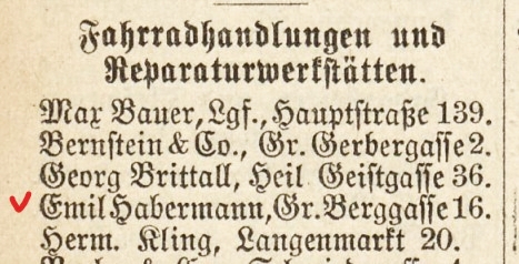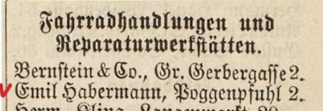 A więc przez około trzy lata mógł pan Habermann prowadzić sprzedaż rowerów na Biskupiej, bo na zdjęciu z planu do filmu „Walet Pikowy”, który kręcono na Biskupiej Górce w 1960 r., widać napis Fahrräder na wykuszu (obecnie zamalowany). Reklama sklepu mogła także znajdować się na fryzie nad parterem na fasadzie, bo spod farby przebija nieczytelny dziś napis.