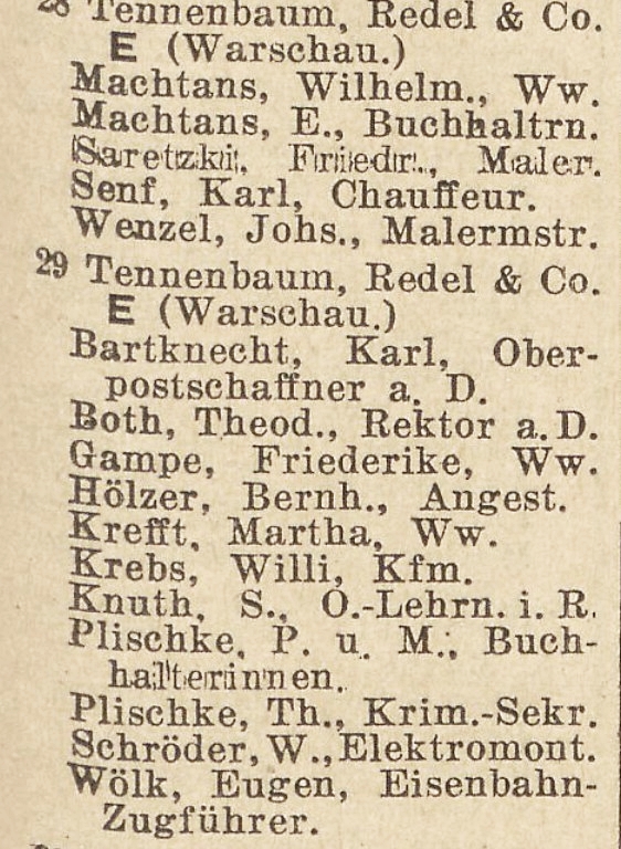 1925 r. – mamy doprecyzowaną firmę: Tannenbaum, Redel & Co., z siedzibą w Warszawie, a od 1926 r. firma ma przedstawicielstwo w Gdańsku na Brotbänkergasse 30 (ul. Chlebnicka); od 1928 na Ankerschmiedegasse (ul. Kotwiczników). Od 1933 r. przedstawicielem firmy jest Matriciani & Co. na Breitgasse 59 (Szeroka). W roku 1928 jeden z lokatorów Willi Stamer prowadzi sprzedaż ziemniaków, owoców i warzyw, oraz węgla i drewna. Najprawdopodobniej odbywało się to w piwnicy, do której wejście jest w przybudówce po lewej stronie fasady.