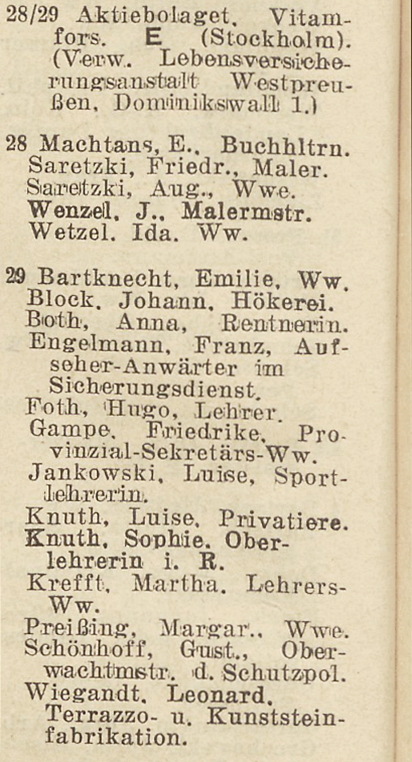 1934 r. – od tego roku obie nieruchomości przechodzą na własność firmy Actiebolaget. Vitamfors. ze Sztokholmu. Przedstawicielem na Gdańsk pozostaje firma Matriciani u. Co., a od 1935 r. Lebensverversicherungsanstalt Westpreussen na Dominikswall 1, czyli Zachodniopruskie Towarzystwo Ubezpieczeń na Życie, budynek stojący w okolicy skrzyżowania Wałów Jagiellońskich i Huciska, obecnie nieistniejący.