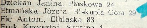 Później, w 1946 r., dostaliśmy mieszkanie przy Biskupiej 29, mieszkania 3, po pani, która nazywała się Trznadel i miała syna Tadeusza. Tam mieszkaliśmy do 1962 r., bo miał być generalny remont tej kamienicy i moja mama się strasznie tego bała. Dostaliśmy mieszkanie na Elbląskiej.