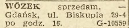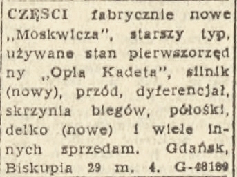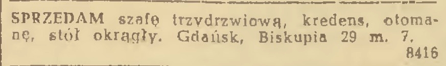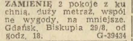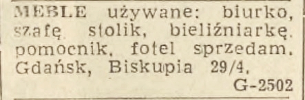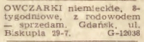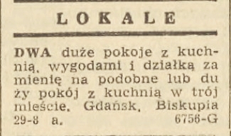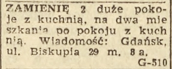 Powojenni mieszkańcy kamienicy Biskupia 29 wiedli swoje gdańskie życie borykając się z problemami dnia codziennego. Mały jego wycinek możemy poznać na podstawie anonsów zamieszczanych w Dzienniku Bałtyckim. Ktoś chciał sprzedać szczeniaki owczarków niemieckich, ktoś inny chciał kupić kota angorę, ktoś sprzedawał części samochodowe a inny motocykl. Jedni lokatorzy szukali mieszkania na zamianę, a inni chcieli sprzedać meble – domyślamy się, że przedwojenne. Ktoś chciał sprzedać wózek, widocznie dziecko już wyrosło, a inny liczył na uczciwego znalazcę zagubionego prawa jazdy. I tak się toczyło życie codzienne…