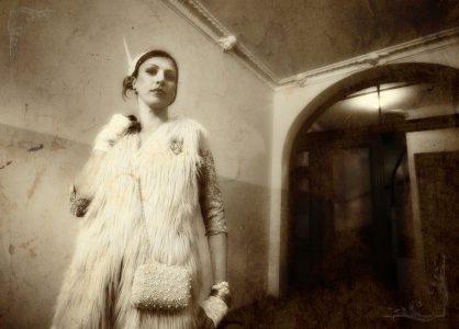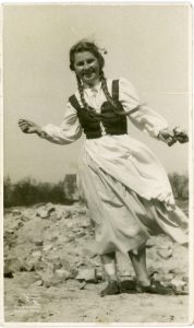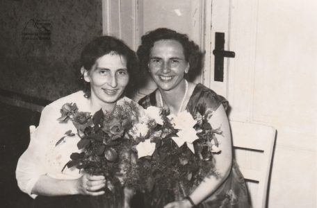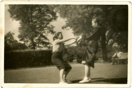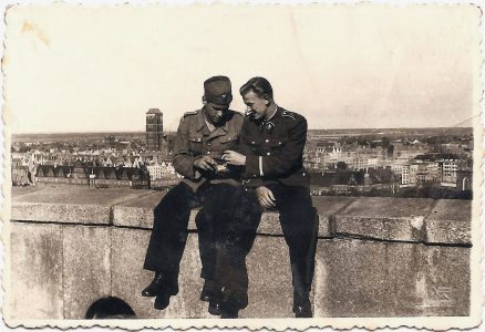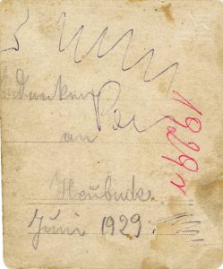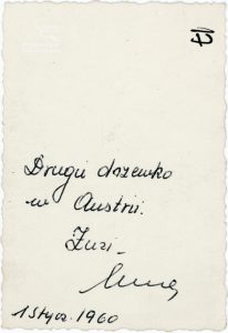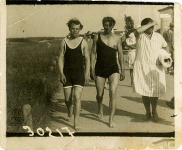 Na strychu wieszało się bieliznę do suszenia, a teraz są mieszkania. I kiedyś na tym strychu na samym końcu znalazłam kartony ze zdjęciami. Wzięłam z tego kartonu dwa zdjęcia. W tym jedno mam do dziś. Przedstawia dwóch panów w strojach kąpielowych i z tyłu jest podpis Heubudy (Stogi – przyp. red.) 1929 r.