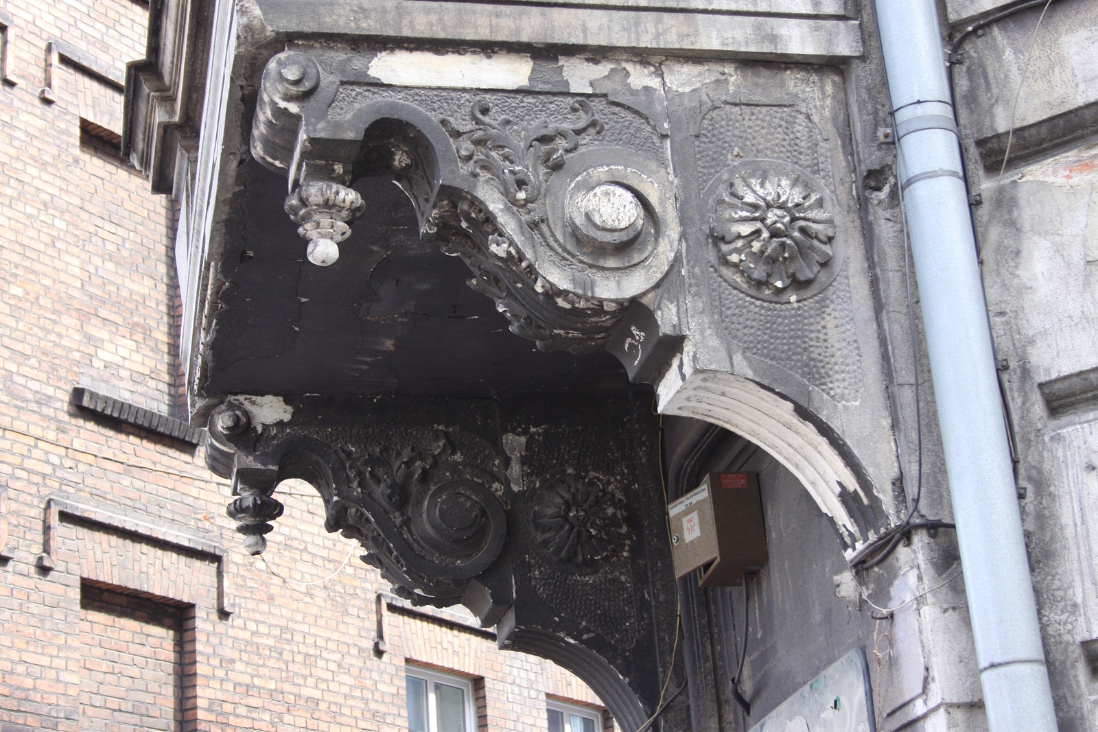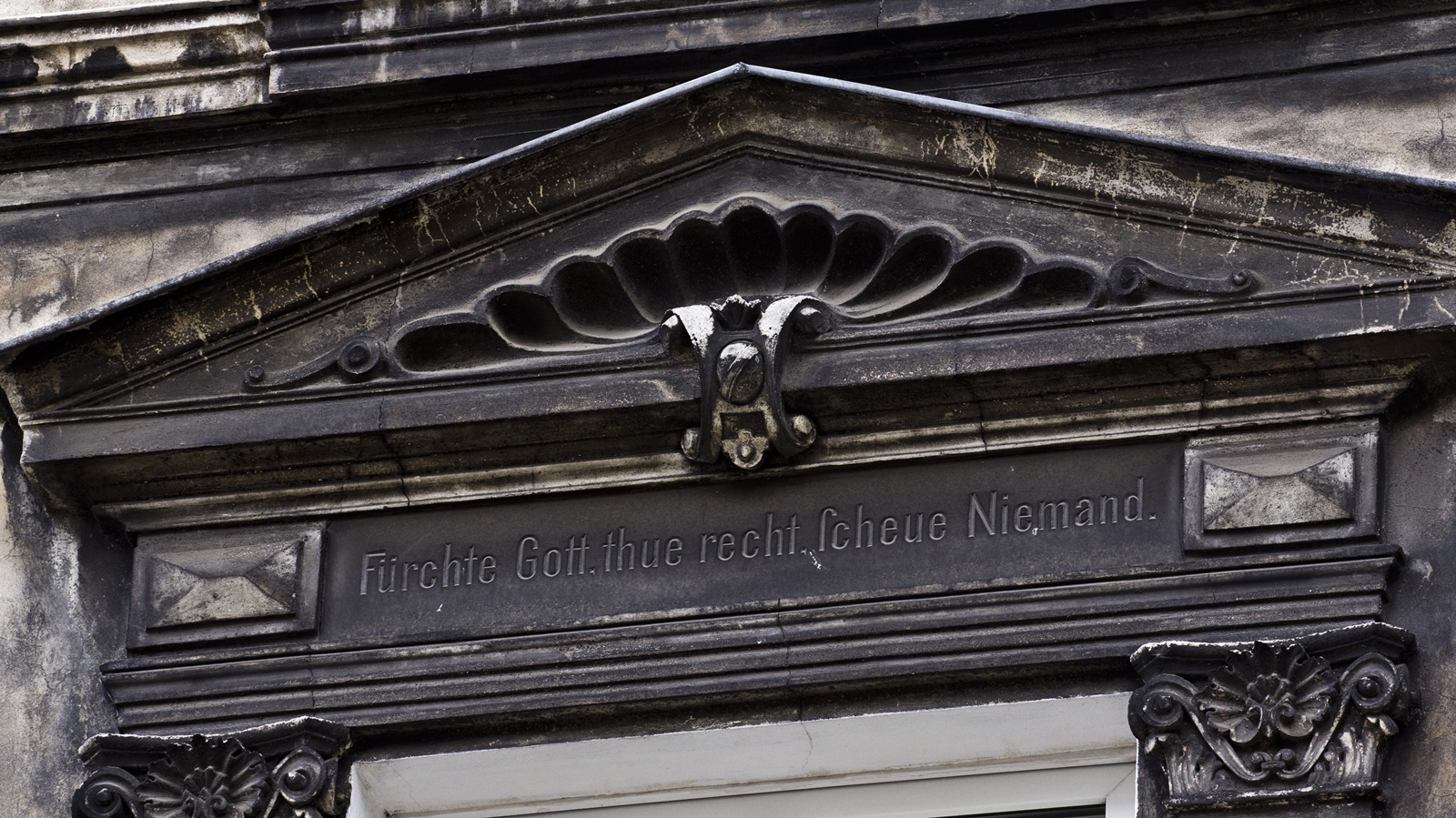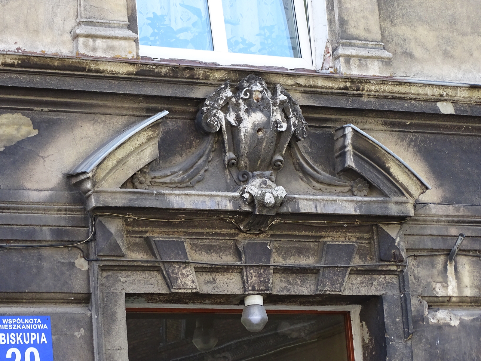 Na osi wejścia nad oknami umieszczono tympanon z głową wojownika, a nad trzecią kondygnacją tympanon w formie niszy muszlowej. Poniżej we fryzie znalazła się inskrypcja Fürchte Gott, thue recht, scheue Niemand. Wywodzi się on z książeczki o chrześcijańskich zasadach życia pastora Johanna Rittmeyera (Die christliche Lebensregel Nr. 55). Oś zakończona jest neobarokowym dwuosiowym szczytem. W naczółku umieszczono rok powstania budynku – 1891, a także kartusz z inicjałami właściciela, Johanna Gustava Schipanskiego. Po bokach spływów znajdowały się obeliski, z których pozostał tylko jeden. Poniżej woluty. Okna w centrum oraz osiach skrajnych drugiej i trzeciej kondygnacji obramowane zostały pilastrami z korynckimi głowicami, podtrzymującymi belkowanie. W przerywanym trójkątnym naczółku znalazły się maszkarony. Pozostałe otwory okienne drugiej i trzeciej kondygnacji ujęte zostały obramieniem z uszakami. Wszystkie okna ostatniego piętra zostały ujęte w opaski, ze zwornikami. Okap podtrzymują kamienne konsole. Parter budynku boniowany.” Ryszard Kopittke „Biskupia Góra – Architektura i Urbanistyka”, niepublikowana praca magisterska UG Wydz. Hist. 2016, str. 86-87.