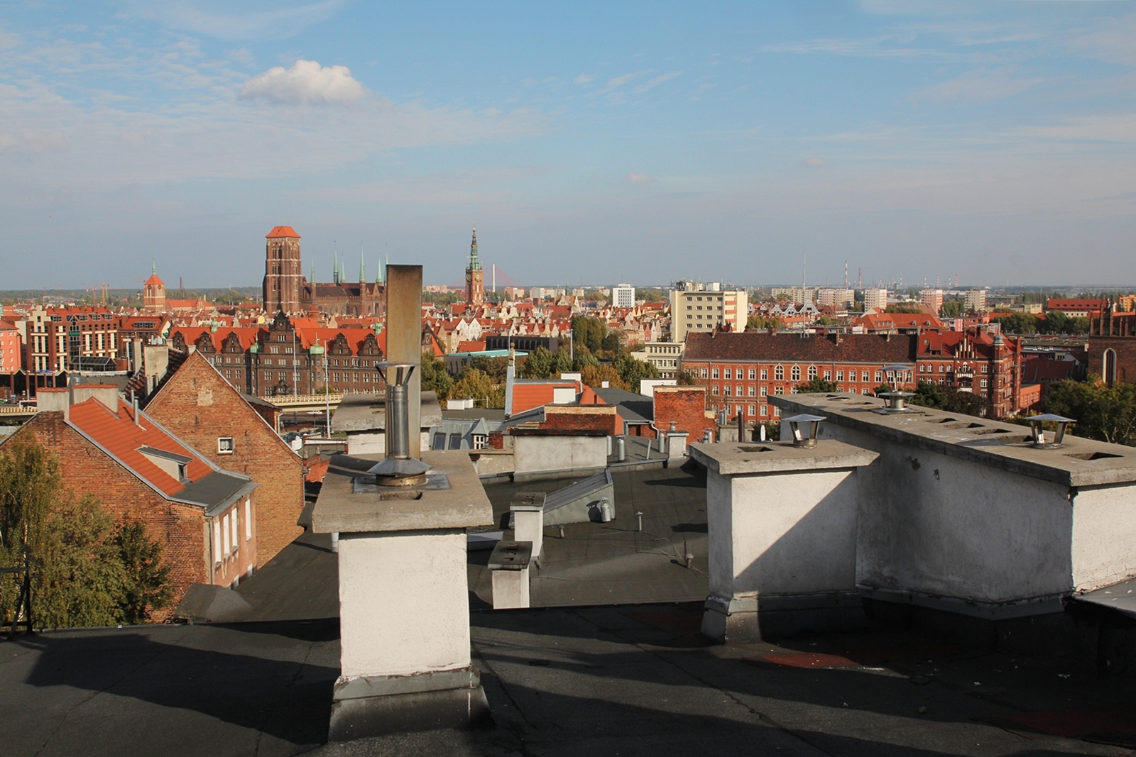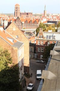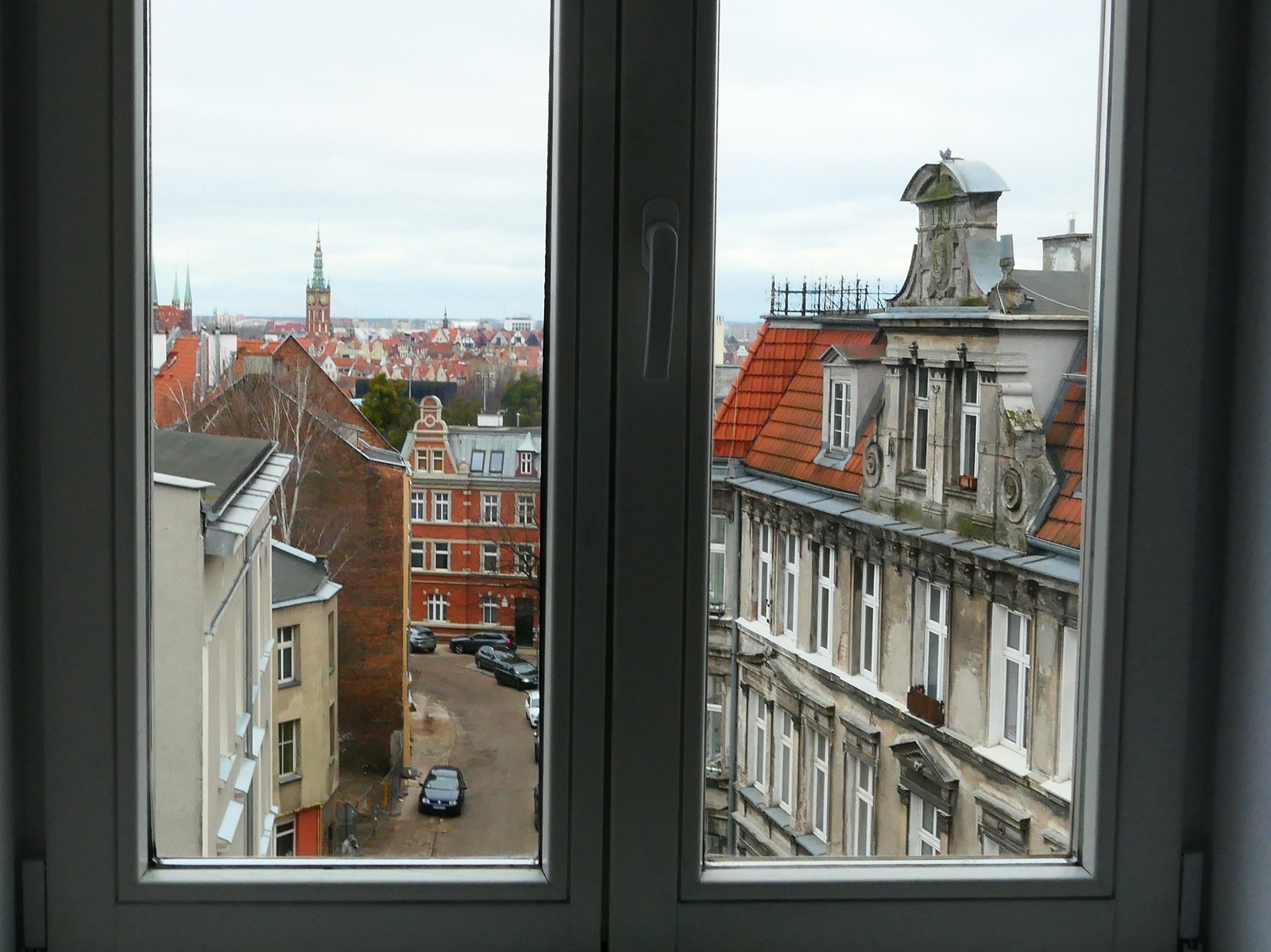 W domu na Biskupiej były trzy pokoje. Taka była wówczas moda, że podłogę trzeba było raz w roku malować na bordowo. Później, w latach sześćdziesiątych już łatwiej było o jakieś chodniki, czy dywany. Trudno było też o firanki, więc w małym pokoju od strony podwórka, były zrobione z gazy aptecznej. Zasłony tata dostał z magazynów UNRA, które były gdzieś chyba w okolicach baraków przy Filharmonii Bałtyckiej. Toaleta to była taka komórka w przedpokoju. W domu był też piękny piec narożny.