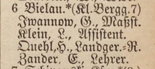 1888 r. – właścicielem jest Hugo Bielau, mieszkający na Kleine Berggasse 7 (późniejsza Am Berge, a po wojnie Górna), a dom ma już adres Grosse Berggasse 6.