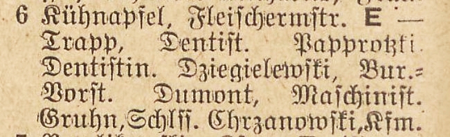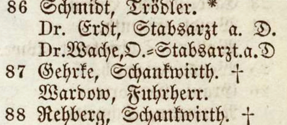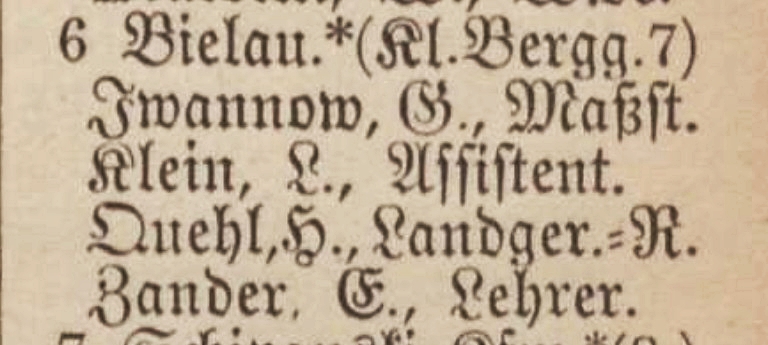 1899 r. – właścicielem jest pan Ortmann, mistrz stolarski mieszkający w Pruszczu, a od 1900 do 1905 r. wdowa po nim, zamieszkała na Kleine Berggasse 9. Rzeźnik Kranich działa do 1902 r., a po nim, w latach 1903-1904 Max Helling, w 1905 r. Otto Taddra.