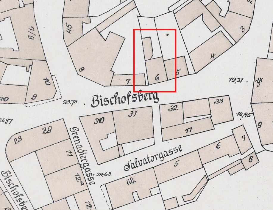 Trzeba też wziąć pod uwagę, że do ok. 1884 r. parcela ta miała adres Schwarzes Meer 87, potem do ok. 1915 r. Grosse Berggasse 6 i od 1916 do 1945 r. Bischofsberg 6.