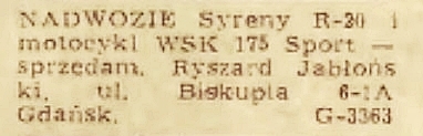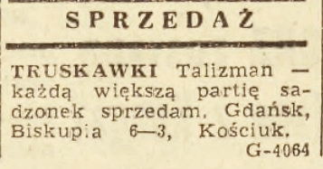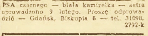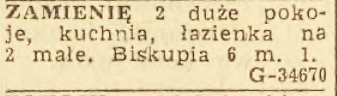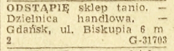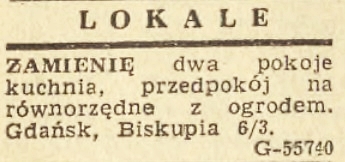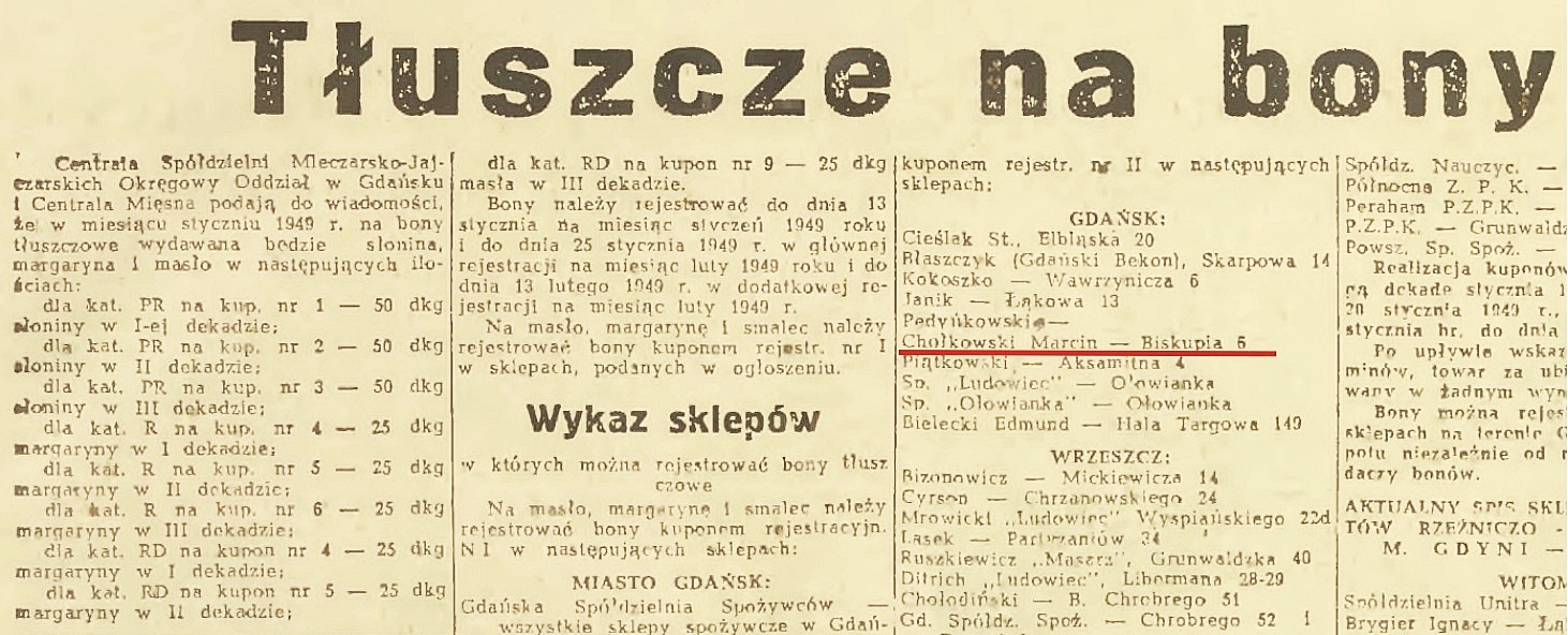 Życie mieszkańców kamienicy Biskupia 6 przez pryzmat anonsów prasowych z czasów PRL zamieszczanych w Dzienniku Bałtyckim. Ciekawostką jest informacja z 1949 r. podająca zasady reglamentacji tłuszczów spożywczych i sklepy, które będą ją realizować, w tym sklep pana Marcina Chołkowskiego na Biskupiej 6.