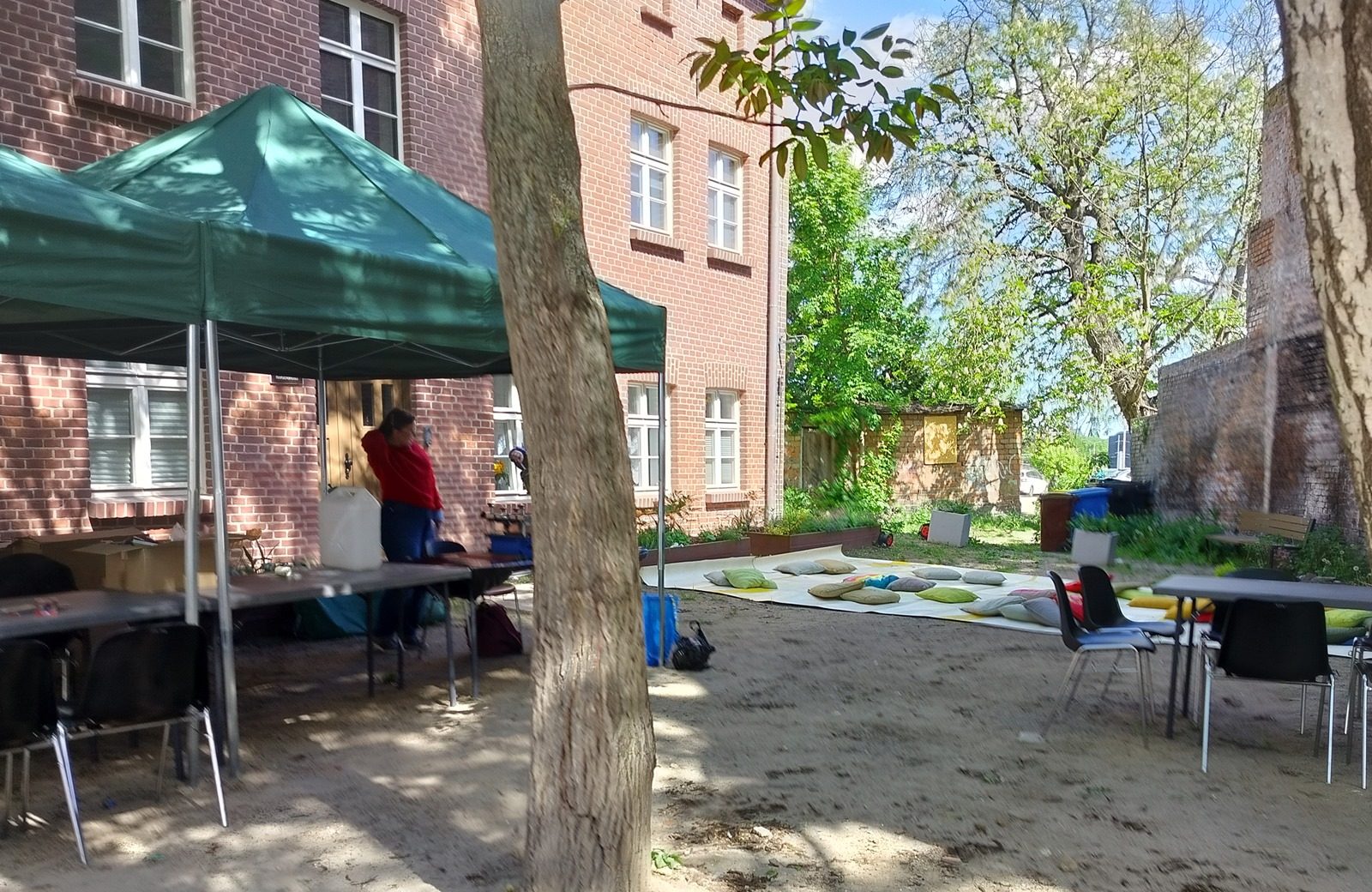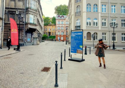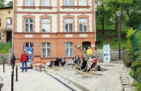Placyk przy Biskupiej 8A w oczekiwaniu na jogę. Tu można było też otrzymać lnianą torbę z odbitą grafiką autorstwa Pawła Króla oraz dostać przypinkę i kartkę z tą grafiką.