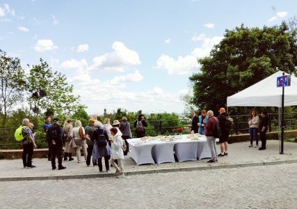 Spacer z lokalną przewodniczką Magdaleną Kamrowską. Na szczycie Biskupiej Górki stały stoły zapraszające do wspólnego zjedzenia śniadania.