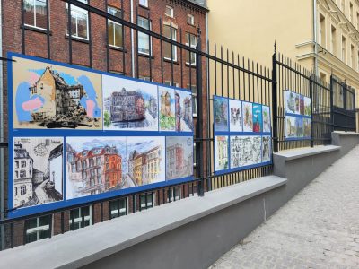 Część prac członków grupy Urban Sketchers Gdańsk z pobytu tu 1 maja br. zawisła na plenerowej wystawie.