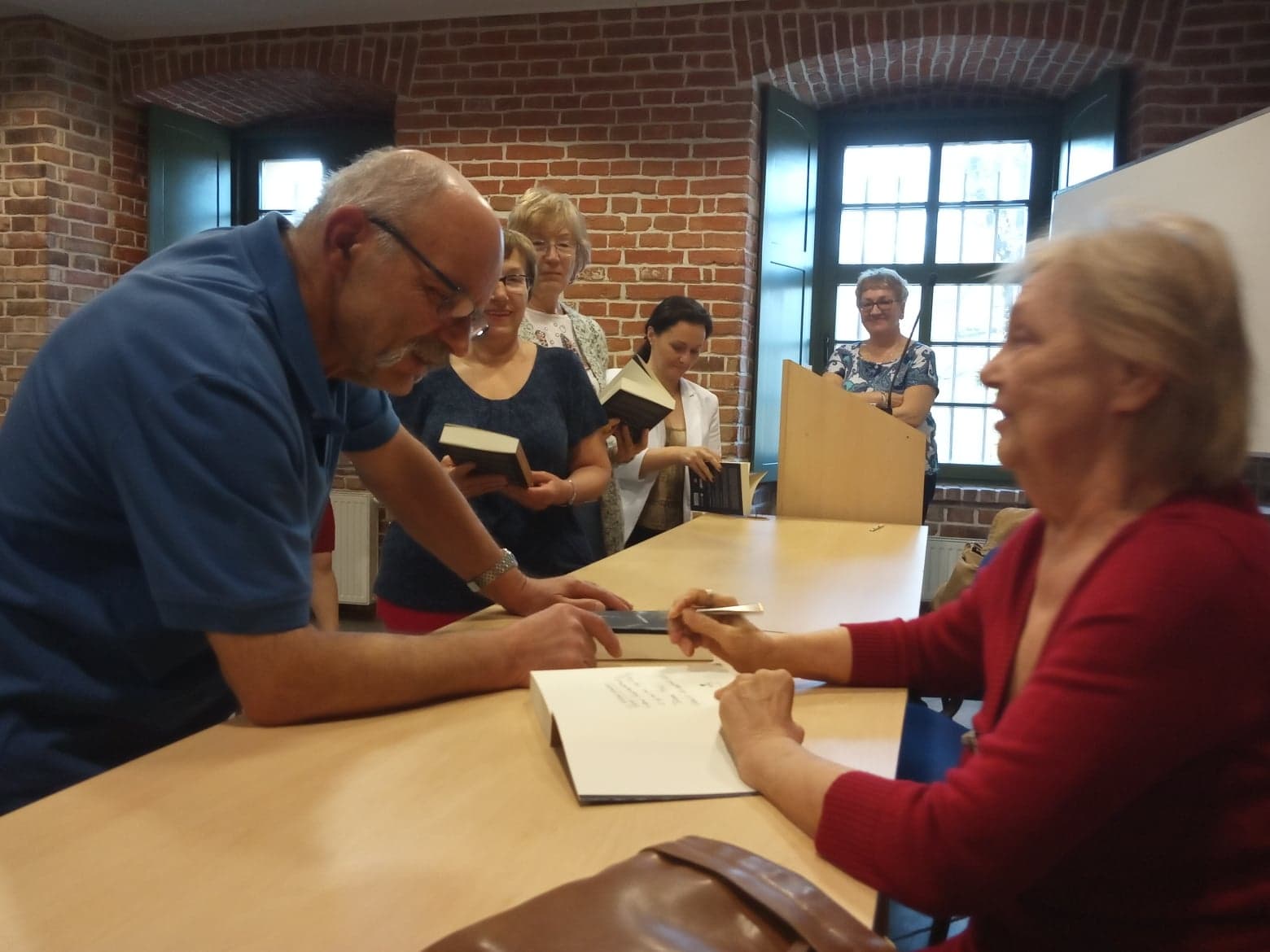 30 sierpnia 2019 r., Pani Emma podpisuje egzemplarze powieści “Królowa Salwatora” dla osób, które wsparły zbiórkę na prowadzenie terenowych poszukiwań pamiątek po “Cafe Bischofshohe”.