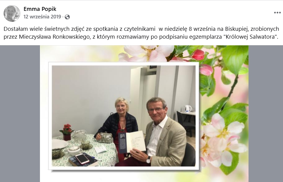 8 września 2019 r. – spotkanie z czytelnikami na Święcie Ulicy Biskupiej. Zrzut ekranu pochodzi z profilu Pani Emmy na Facebooku: https://www.facebook.com/emma.popik