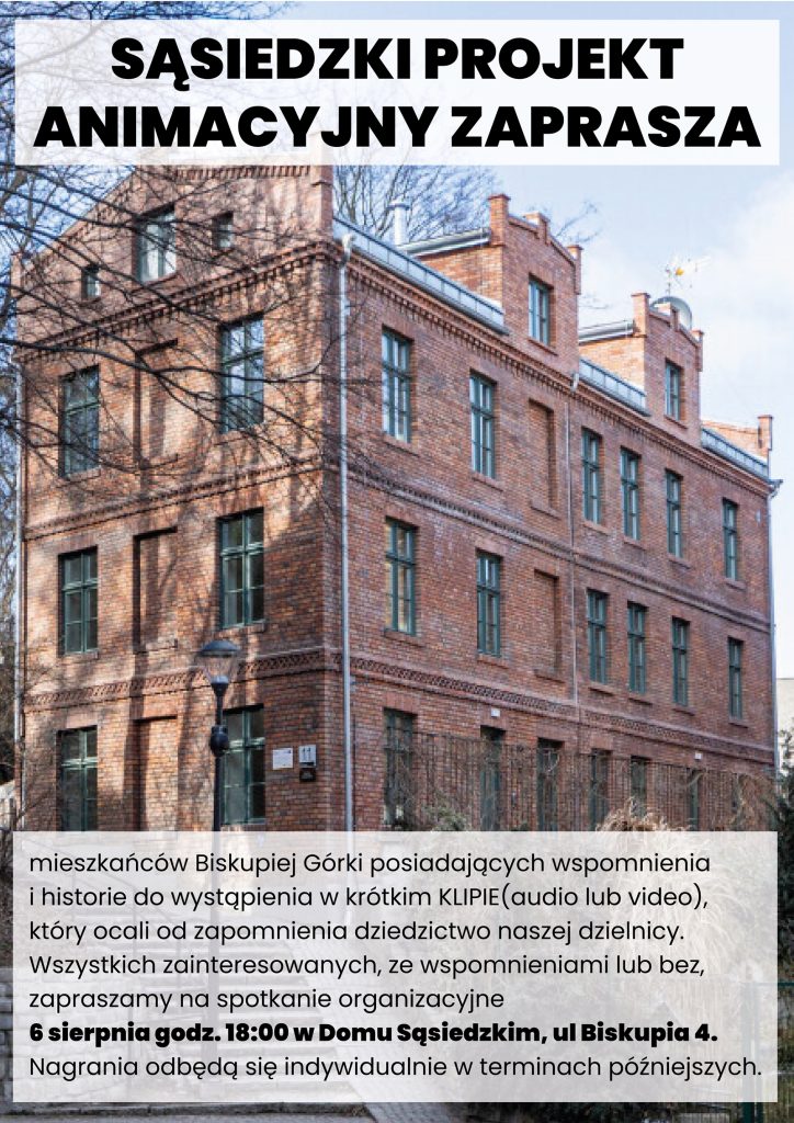 “Razem z Biskupią Górką przeżyliśmy już wiele, dobrego i złego. Nareszcie przyszedł moment, by móc trochę o tym wszystkim powspominać, jak i parę historii o naszej dzielnicy opowiedzieć. A wszystko to w ramach sąsiedzkiego projektu animacyjnego. Wy pogadacie my ponagrywamy krótkie KLPY (video lub audio), no i razem stworzymy coś, co nie pozwoli o naszej dzielnicy zapomnieć! Wszystkich zainteresowanych projektem, ze wspomnieniami lub bez, z całego serducha zapraszamy na spotkanie organizacyjne, które odbędzie się 6 sierpnia o 18:00 w Domu Sąsiedzkim przy ul. Biskupia 4. Na spotkaniu przedstawimy wszystkie szczegóły i nasze plany realizacyjne, chętnie także usłyszymy jakie są Wasze pomysły. Zróbmy to razem dla nas i naszej dzielnicy, oj, bo mamy czym się chwalić :)!